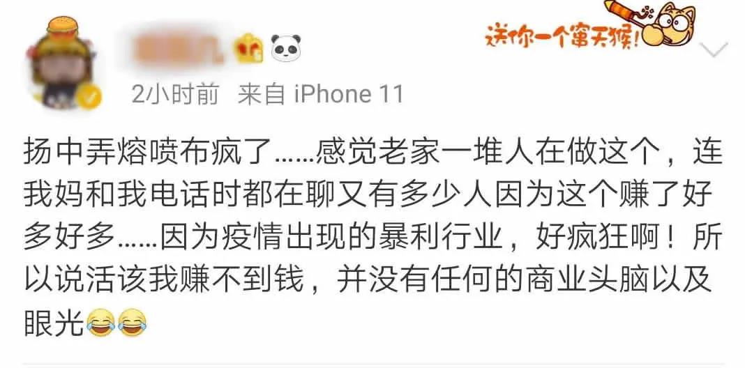 一個(gè)揚(yáng)中的網(wǎng)友在微博上說(shuō):揚(yáng)中弄熔噴布瘋了.....感覺(jué)老家一堆人在做這個(gè),連我媽和我電話時(shí)都在聊又有多少人因?yàn)檫@個(gè)賺了好多好多......