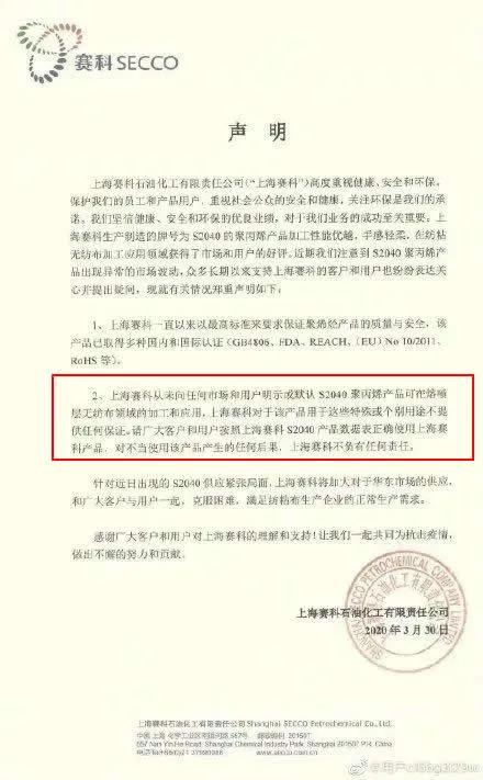 對(duì)于S2040聚丙稀能否應(yīng)用到熔噴布生產(chǎn),上海賽科也出了一份聲明,聲明上寫到:上海賽科從未向任何市場(chǎng)和用戶明示或默認(rèn)S2040聚丙稀產(chǎn)品可以用于無(wú)紡布領(lǐng)域的加工和應(yīng)用。上海賽科對(duì)于該產(chǎn)品用于這些特殊或個(gè)別用途不提供任何保證。